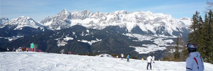 Bei strahlendem Wetter fand unser zweites Schi-Wochenende auf der Reiteralm in Schladming statt. Links der Rötelstein und in der Mitte das Dachsteinmassiv.