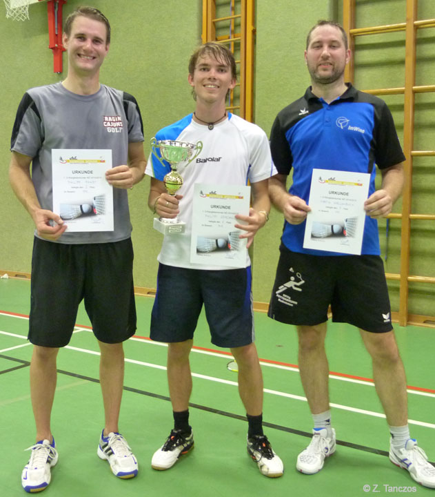 Die große Überraschung war jedoch der (D-)Turnier-Neuling Philipp Graßmück. Die erste Gruppenphase hat er mit drei von drei Siegen geholt, wobei er einen einzigen Satz gegen Paul Gruber abgegeben hatte. In dem Kampf für die ersten drei Plätze verliert er in einer Dreisatzparty gegen dem Erstgesetzten Martin Wallenböck, gewinnt aber das Spiel gegen Philipp Fendt. Martin Wallenböck kann aber sein zweites Spiel gegen Fendt nicht gewinnen und rutscht unglücklich wegen seinem schlechten Satzverhältnis auf den dritten Platz herunter. Mit drei gewonnenen Sätzen sichert Philipp Graßmück den Sieg und holt den Pokal im Herreneinzel.