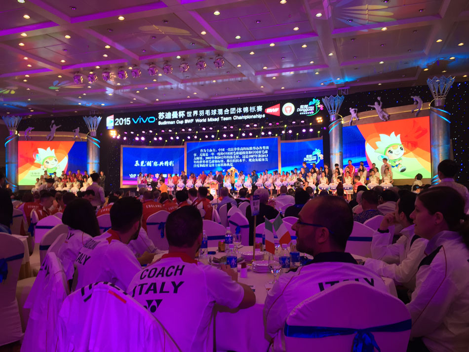 Am Donnerstag um 16:05 Uhr sind wir von Wien nach Doha geflogen und dann weiter nach Guangzhou. Von dort ging es mit dem Bus weiter nach Dongguan weiter, wo der Sudirman-Cup (Team-WM) stattfindet. Um 19:00 Uhr (Ortszeit, +6 Stunden) sind wir im Hotel angekommen und mussten gleich direkt zum Welcome-Dinner.