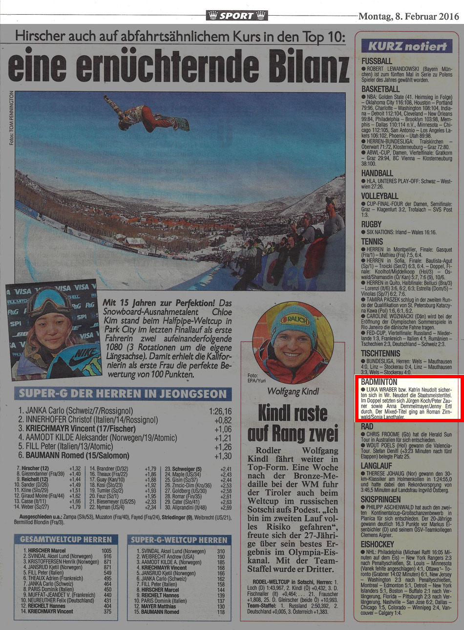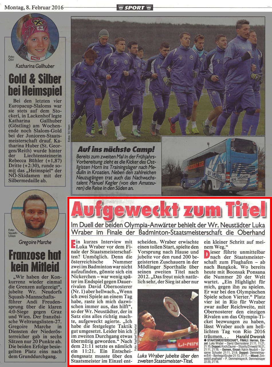 AUFGEWECKT ZUM TITEL / Im Duell der beiden Olympia-Anwärter behielt der Wr. Neustädter Luka Wraber im Finale der Badminton-Staatsmeisterschaft die Oberhand.