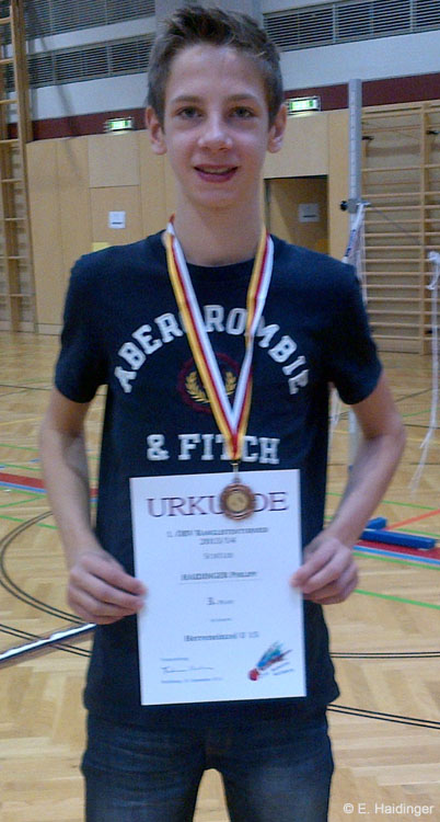 Im Spiel um Platz 3, dem sogenannten kleinen Finale, zeigte Philipp wieder was er kann und spielte hervorragend. Der Gegner hatte nicht eine Sekunde lang eine Chance und Philipp gewann ganz klar in zwei Sätzen mit 21:8/21:12 und durfte sich auf Bronze freuen.