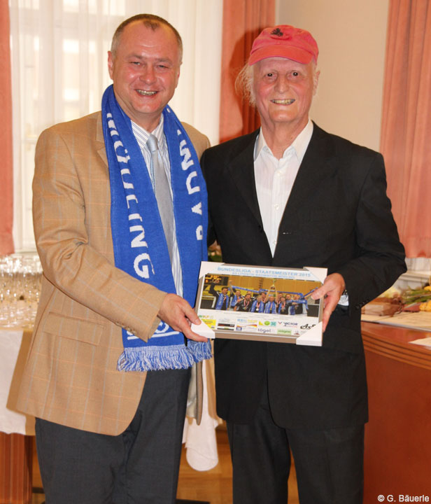 Neubauer begann mit der Überreichung unseres Fanschals und des Staatsmeister-Siegerbildes an Bgm Hrn. Hans Stefan Hintner und erinnerte sich an den Tag des Sports, als der Hr. Bürgermeister an unseren Stand kam und am Netz gekonnt Ballwechsel mit Hingabe spielte.