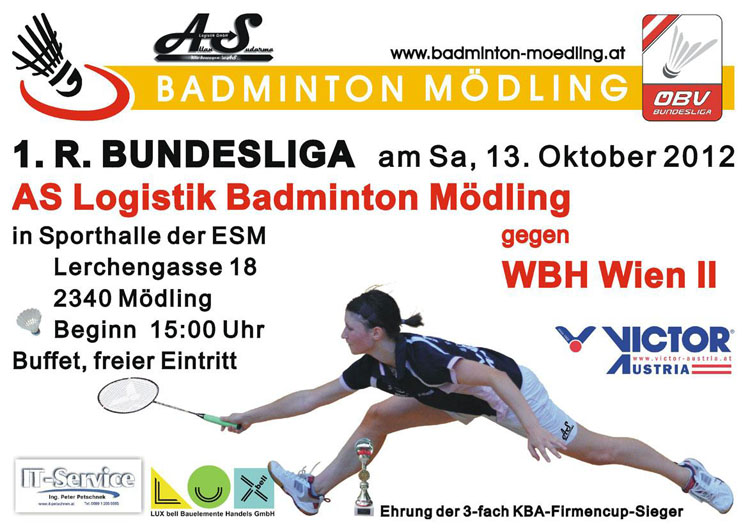 Am Samstag, 13.10., ist es wieder so weit! Mit dem Heimspiel AS Logistik Badminton Mödling gegen WBH II startet die diesjährige Bundesligasaison für unsere Mannschaft! Gespielt wird in der neuen Sporthalle der Europasportmittelschule, Lerchengasse 18. Beginn ist um 15:00.