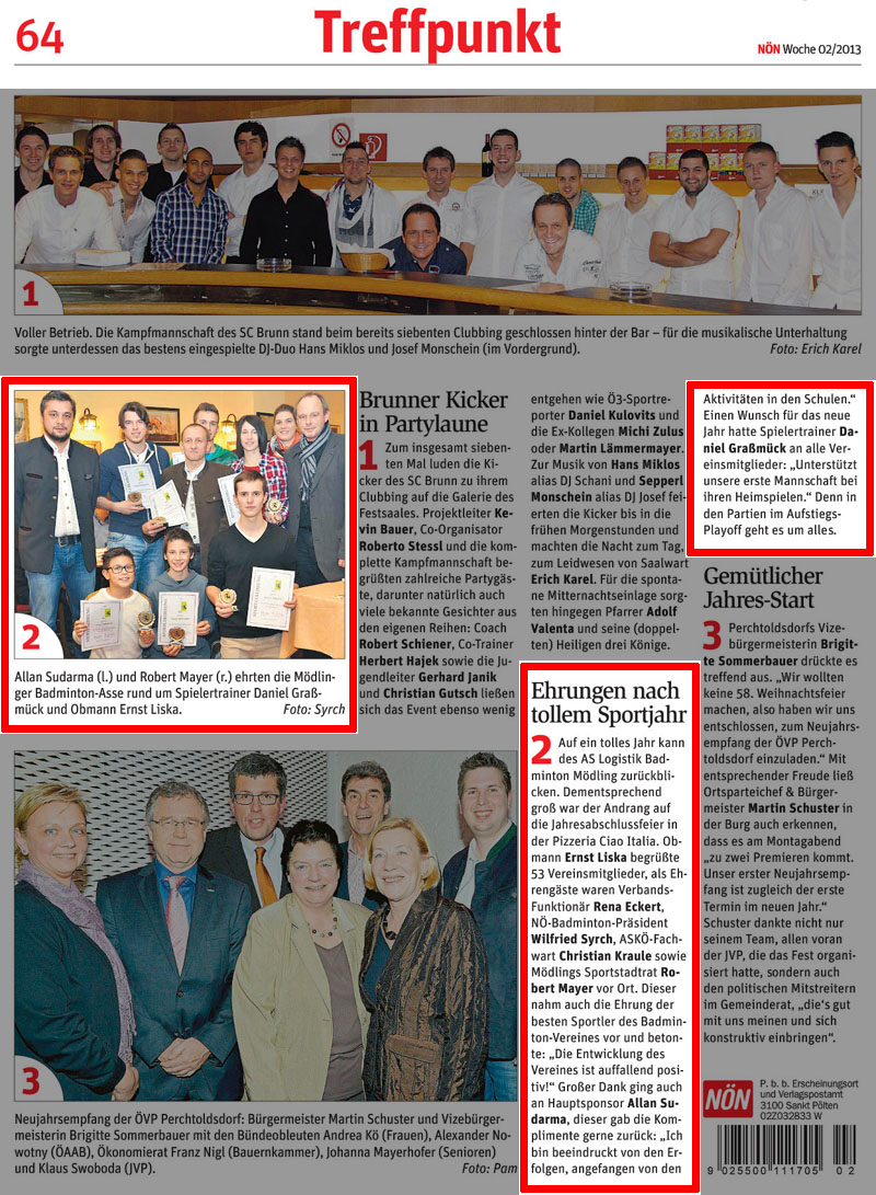 EHRUNG NACH TOLLEM SPORTJAHR / Sponsor Allan Sudarma und Sportstadtrat Robert Mayer ehrten die Mödlinger Badminton-Asse.