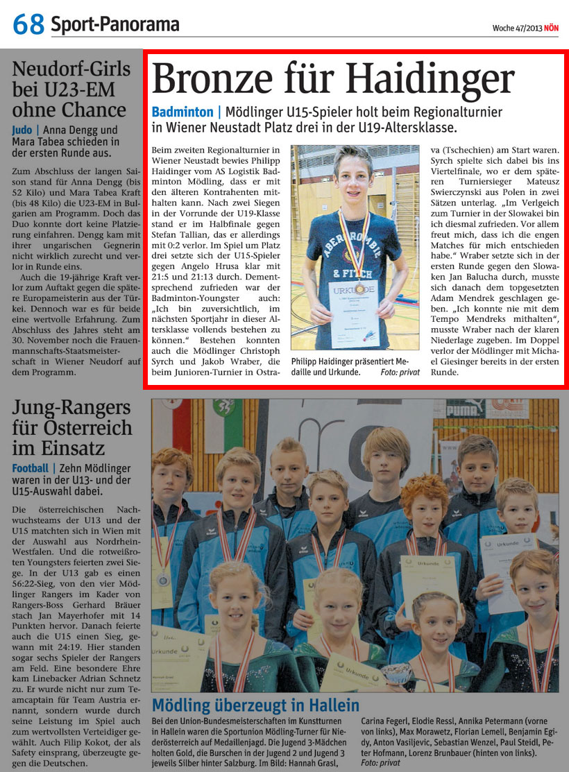 BRONZE FÜR HAIDINGER / Mödlingeer U15-Spielerholt beim Regionalturnier in Wr. Neustadt Platz drei in der U19-Altersklasse.