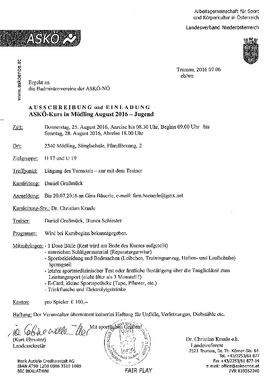 ASKÖ-Kurs für Jugend und Schüler vom 25.- 28.08.2016 in Mödling.Anmeldungen werden noch angenommen.