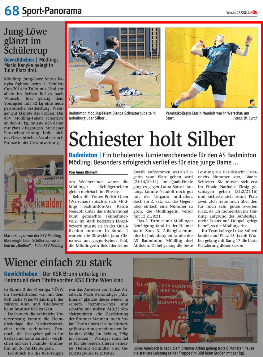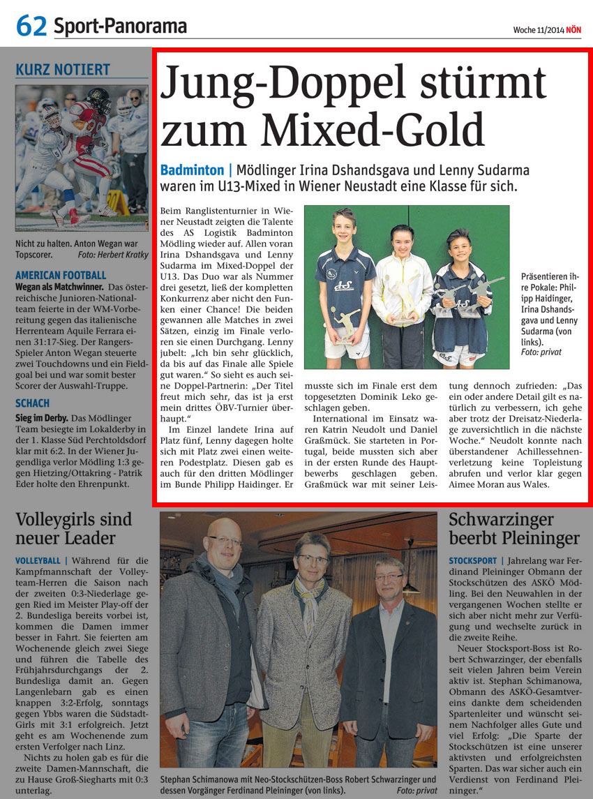 Die erst 16-jährige Corinna Karlovits gab im Turnier nur einen einzigen Satz ab und gewann überlegen den DE-Bewerb. Im DD- und MIX-Bewerb holte die Mödlingerin je einen 3. Platz.