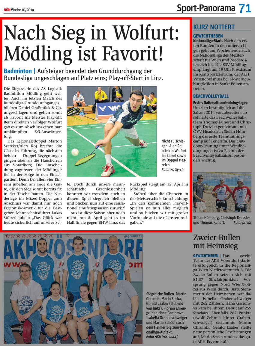 Die letzte Runde des Grunddurchgangs der Badminton-Bundesliga fand am Samstag, 1.3., mit einem Auswärtsspiel bei UBSC Wolfurt statt. Auch heute blieb Mödling durch einen glücklichen 5:3-Sieg ungeschlagen. Als einziger Bundesliga-Verein erreichte die Mödlinger Mannschaft in 10 Spielen 6 Siege, 4 Unentschieden und wurde als Aufsteiger aus der 2. Bundesliga auf Anhieb sensationell Erster des Grunddurchganges.