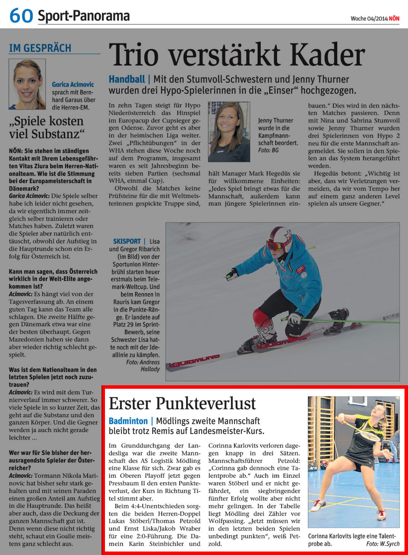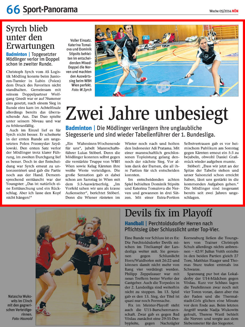 Im ersten Herrendoppel unterlagen Sudarma/Petschnek mit 8-21 16-21 der starken Paarung Haltau/Melmer. Nach klar verlorenem ersten Satz kamen die beiden Mödlinger besser ins Spiel und hatten alle Möglichkeiten den zweiten Satz zu gewinnen. Eine Portion Glück der Gegner verhinderte dies jedoch.