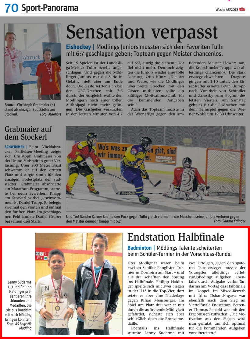 Zum 2 ÖBV Schüler Ranglistenturnier vom 23.11-24.11 reisten für den AS Logistik Badminton Mödling Irina Dhandshgava, Lenny Sudarma (beide U13) und Philipp Haidinger (U15) nach Dornbirn. Philipp konnte im Einzel den 3ten Platz erreichen. Lenny war im Doppel sowie im Mixed mit Irina erfolgreich.