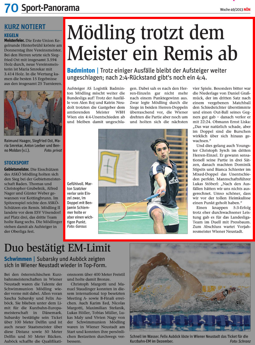 Für das Bundesligaspiel zwischen AS Logistik Badminton Mödling und WBH Wien am 30.11. hat sich dank des Einsatzes von Allan Sudarma ein ORF Team angekündigt um einen Filmbeitrag mit Schwerpunkt Nachwuchsarbeit zu drehen! Wir freuen uns sehr, dass sich unser Verein dadurch vor einer großen Menge präsentieren kann!