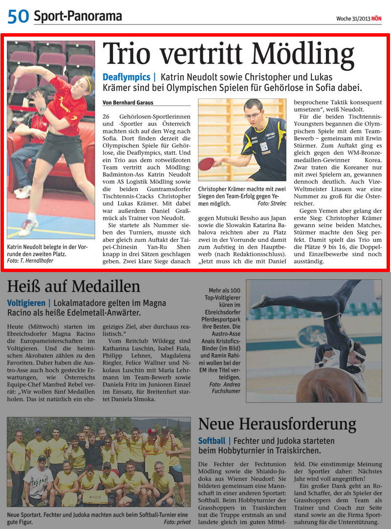 Nach den DEAF-Weltmeisterschaften in Bucheon/Korea im Oktober 2011, wo Katrin Neudolt das Achtelfinale erreicht hat wurde die Mödlingerin vom Österreichischen Gehörlosen Sportverein für die Sparte Badminton als einzige Österreicherin zu den „Deaflympics“ entsandt. Das sind die Olympischen Spiele für Gehörlose.