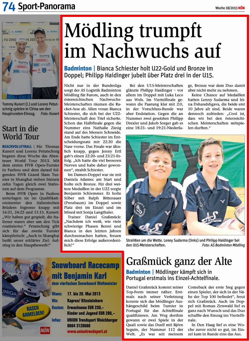 MÖDLING TRUMPFT IM NACHWUCHS AUF / Bianca Schiester holt U22-Gold und Bronze im Doppel; Philipp Haidinger jubelt üer Platz drei in der U15.