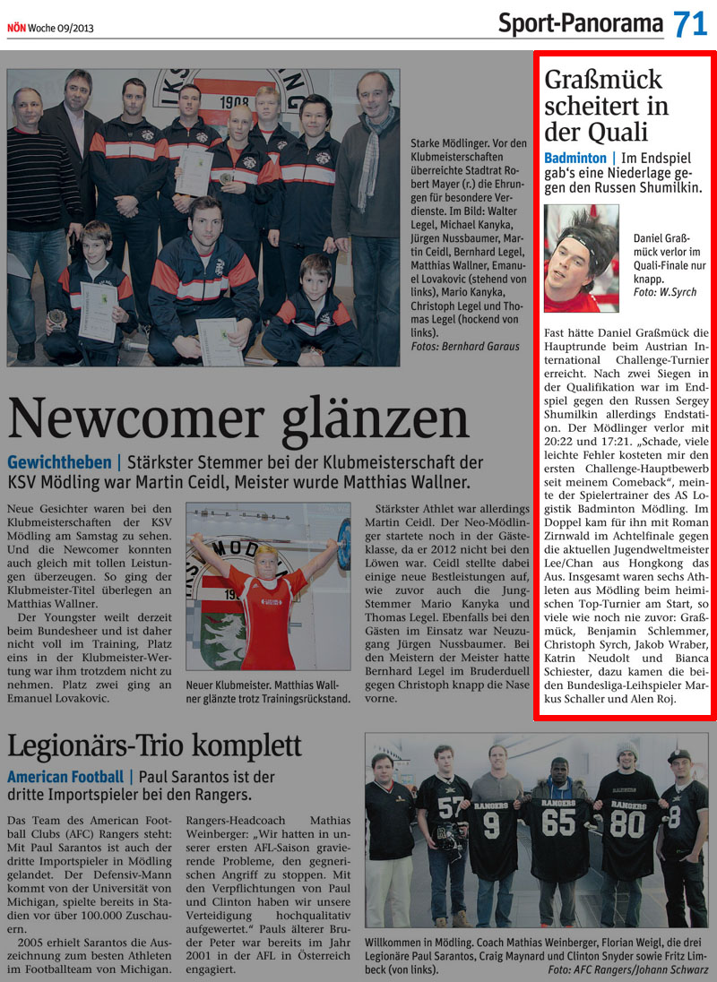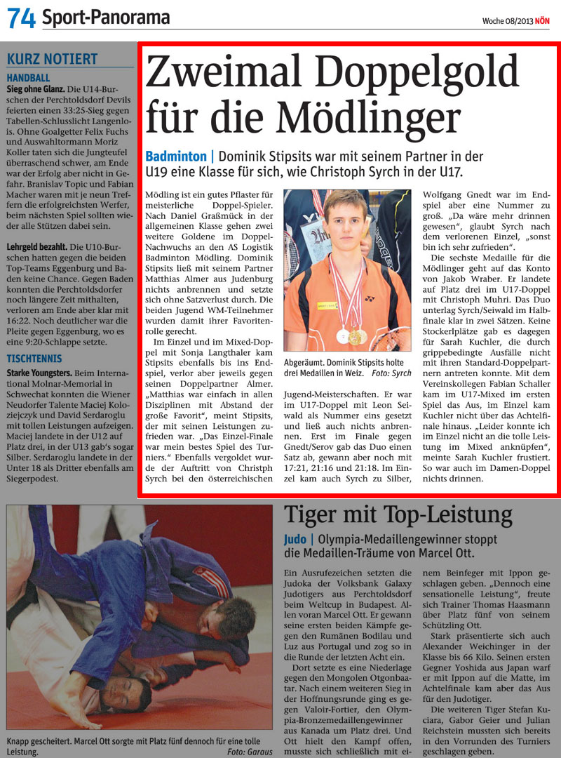 Von Mittwoch 20.2 - Samstag 23.2. finden wieder die Austrian International Challenge 2013 in der Wiener Stadthalle B statt. Von Mödling haben dieses Jahr gleich 6 SportlerInnen genannt. Der Eintritt ist wie jedes Jahr frei!
