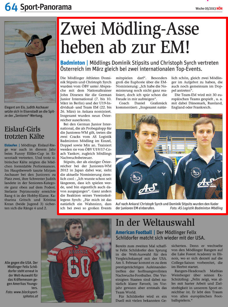 Die Mödlinger Athleten Dominik Stipsits und Christoph Syrch wurden vom ÖBV unter Absprache mit dem Nationaltrainer John Dinesen für die German Junior International vom 07.-10.03.2013 in Berlin und der U19-Individual- und Team EM in Ankara nominiert.