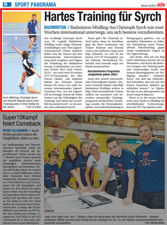 BE (Badminton Europe Confederation) lud die U17/19-Teamspieler über die nationalen Verbände zur Summer School 2012 nach Otočec in Slowenien (14 – 21.07.2012) ein.