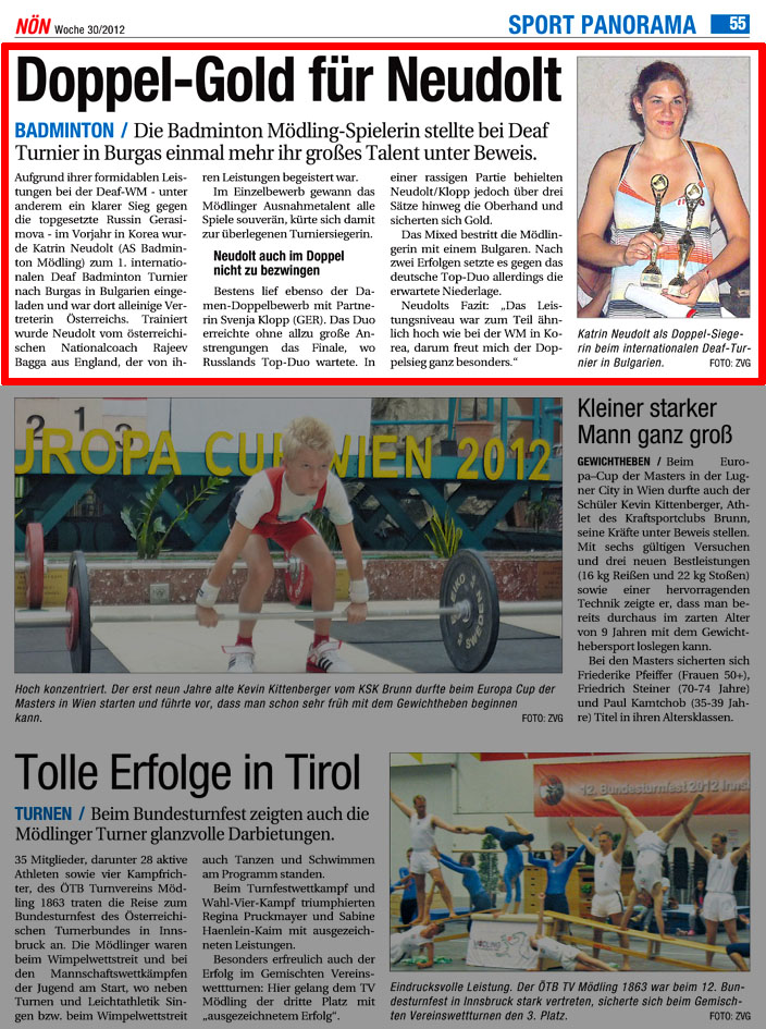 Aufgrund der Leistungen der Mödlingerin bei den Deaf-Weltmeisterschaften im Oktober vorigen Jahres in Bucheon /Korea wurde Neudolt zum 1. europäischen Deaf Badminton Turnier, als einzige aus Österreich eingeladen.