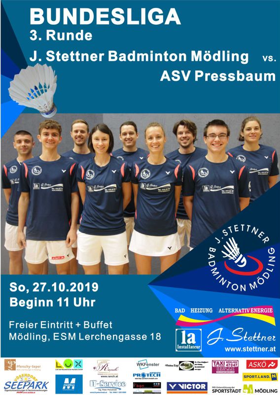 Am Wochenende findet in der Badminton Bundesliga eine Doppelrunde statt. Nachdem unser Team am Samstag, 26.10.2019 um 16:00 auswärts auf Titelverteidiger ASKÖ Traun trifft, kommte es am Sonntag, 27.10.2019 zum Niederösterreich Derby in der Sporthalle der ESM Mödling zum Aufeinandertreffen mit dem ASV Pressbaum.