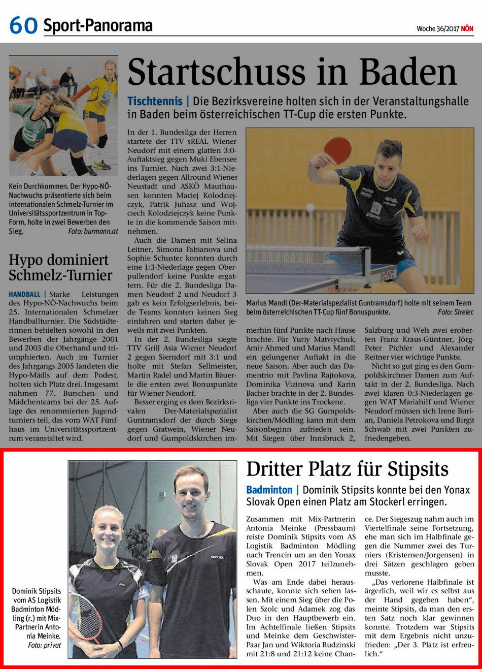 Die Slovak Open 2017 zählt zu den Future Series und fanden vom 30.08.- 02.09.2017 in Trencin/Slowakei statt. Es nannten 166 SpielerInnen, davon 60 Damen aus ganz Europa. Aus Mödling reiste Dominik Stipsits an, der im MIX mit seiner Partnerin Antonia Meinke aus Pressbaum antrat. Das NÖ-Duo holte sich den beachtlichen 3. Platz.