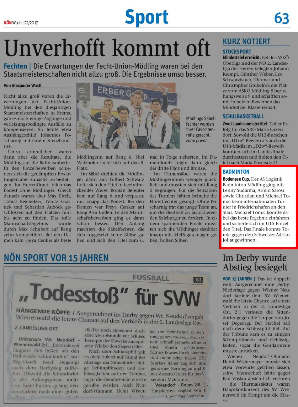 Der Bodensee-Cup in Friedrichshafen (26.- 28.05.2017) wurde heuer zum bereits 50. Mal ausgetragen. Am Start waren 366 Teilnehmer aus diversen europäischen Ländern. Auch Mödling war durch Armin Sárosi, Lenny Sudarma, Christian und Michael Tomic vertreten. Betreut wurden die Jungs von Bianca Schiester. Gespielt wurde im Einizel in Gruppen und dann KO System, Doppel nur im KO Raster. Armin, Christian und Michi starteten im U15 Bewerb, Lenny im U17 Bewerb.