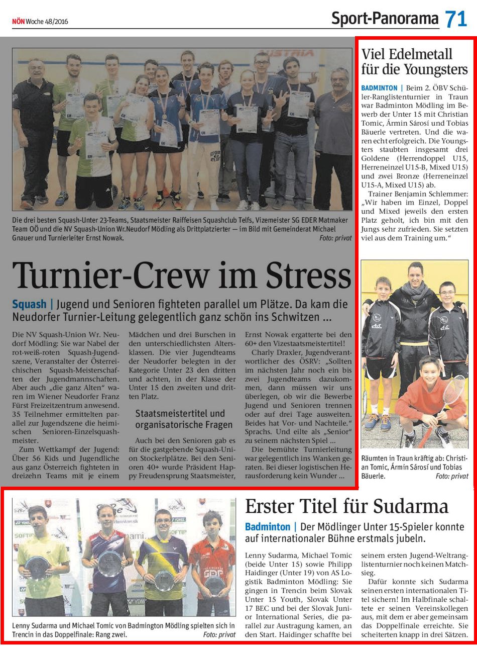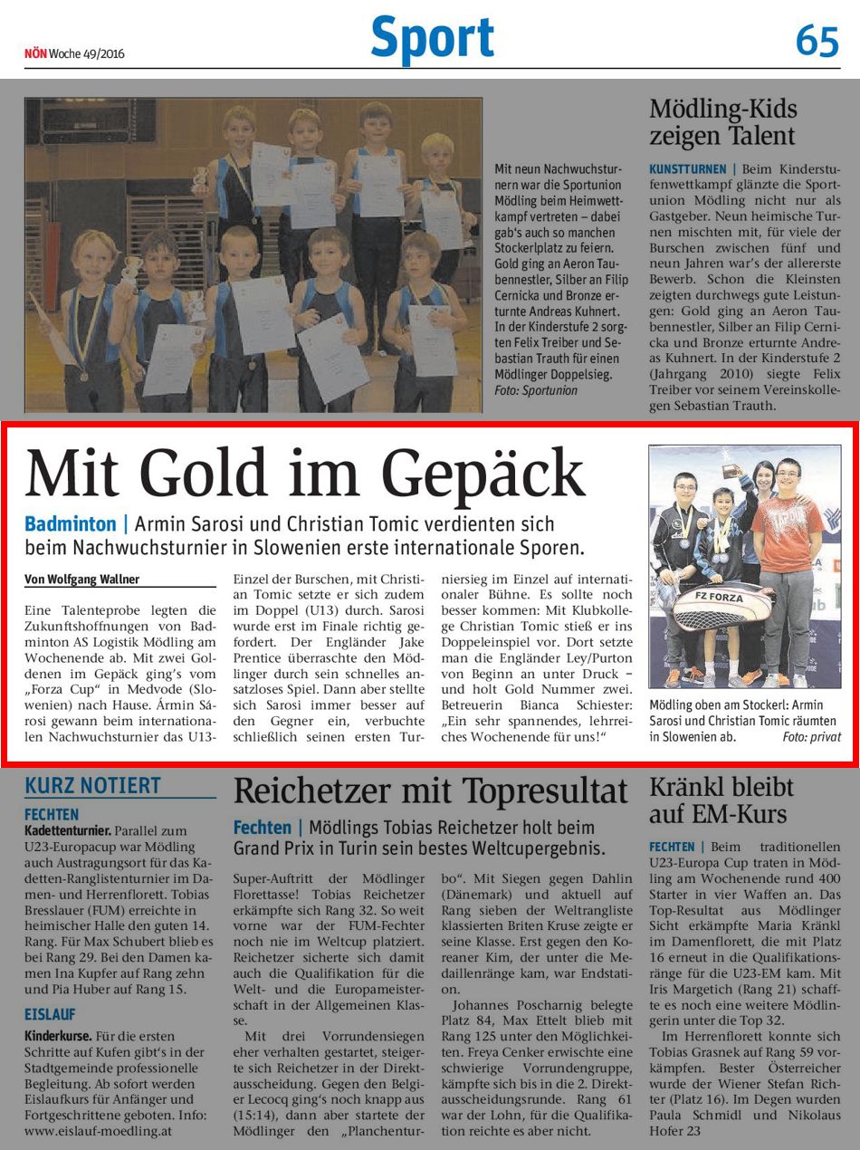 Am Wochenende vom 3. und 4. Dezember fand im Slowenischen Medvode der Forza Cup 2016 statt, ein internationales Nachwuchsturnier. Aus Mödling traten Ármin Sárosi, Christian und Michael Tomic mit Betreuerin Bianca Schiester die Reise nach Medvode an. Lenny Sudarma musste leider kurzfristig wegen einer Verletzung absagen. Die Mödlinger Youngsters zeigten eine starke Leistung und konnten 2 Goldmedaillen (Ármin im Herreneinzel U13, Ármin und Christian im Doppel U13) mit nach Hause nehmen.