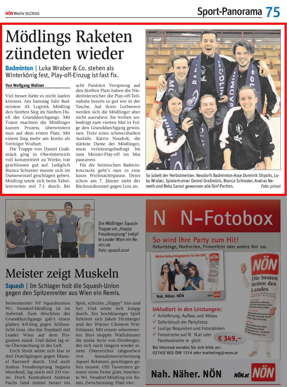 Am Wochenende vom 3. und 4. Dezember 2016 fand das 2. ÖBV C-Ranglistenturnier statt. Austragungsort war die Rundhalle Lieblgasse im 22. Wiener Gemeindebezirk. Insgesamt nahmen 28 Herren und 12 Damen am Turnier teil. Aus Mödling traten 9 SpielerInnen an: Susanne Swoboda, Gina Bäuerle, Jennifer Ludwigs, Kathrin Kollmann und Malou Schaub sowie Ernst Liska, Philipp Graßmück, Roland Sudarma und Georg Walter. Die Mödlinger brachten insgesamt 2 x Gold (Mixed, Dameneinzel), 1 x Silber (Damendoppel) und 1 x Bronze (Damendoppel) mit nach Hause, wobei hier vor allem die Damen sehr erfolgreich waren.