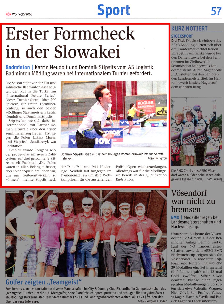 An dem internationalen Jugendturnier (10.+ 12.09.2016) nahmen 101 Burschen und 52 Mädchen aus Mitteleuropa teil. Der 13-jährige Mödlinger Michael Tomic und der 11-jährige Armin Sarosi reisten mit ihrem Coach den Mödlinger BL-Spieler an.