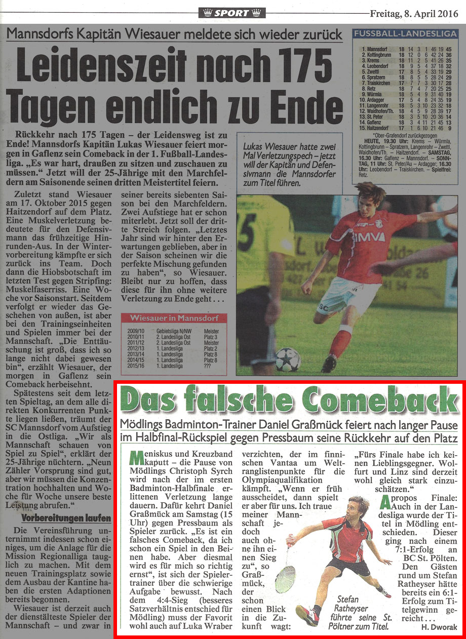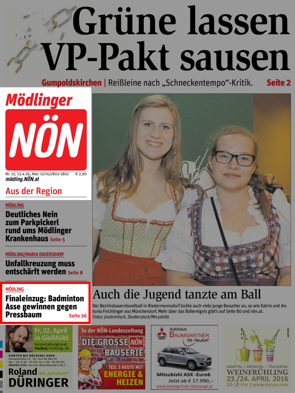 Am Donnerstag, den 14.04.16 fand die letzte Oberligabegegnung dieser Saison in der Sporthalle Mödling statt. Unser Gegner war Badminton Wiener Neustadt II. Die Begegnung endete mit einem 8:0 Sieg für uns, den wir ohne einen einzigen Satzverlust feiern konnten! Dieses Ergebnis spricht für sich: Alle SpielerInnen zeigten eine souveräne Leistung, wodurch in keinem Match der Sieg ernsthaft gefährdet war.