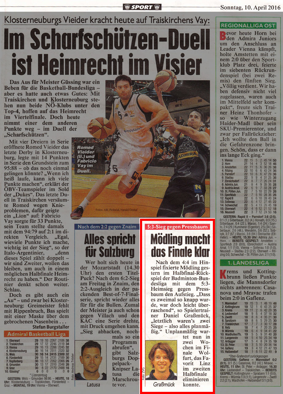 Am Samstag, 9.4., fand das Rückspiel des PlayOff-Semifinales der Badminton Bundesliga statt. Wie schon im Hinspiel setzte sich unsere Mannschaft in einer dramatischen Begegnung mit 5:3 durch, stellte somit auf 2:0 in der Best-of-Three Serie und ist somit wie im letzten Jahr fürs Finale qualifiziert.