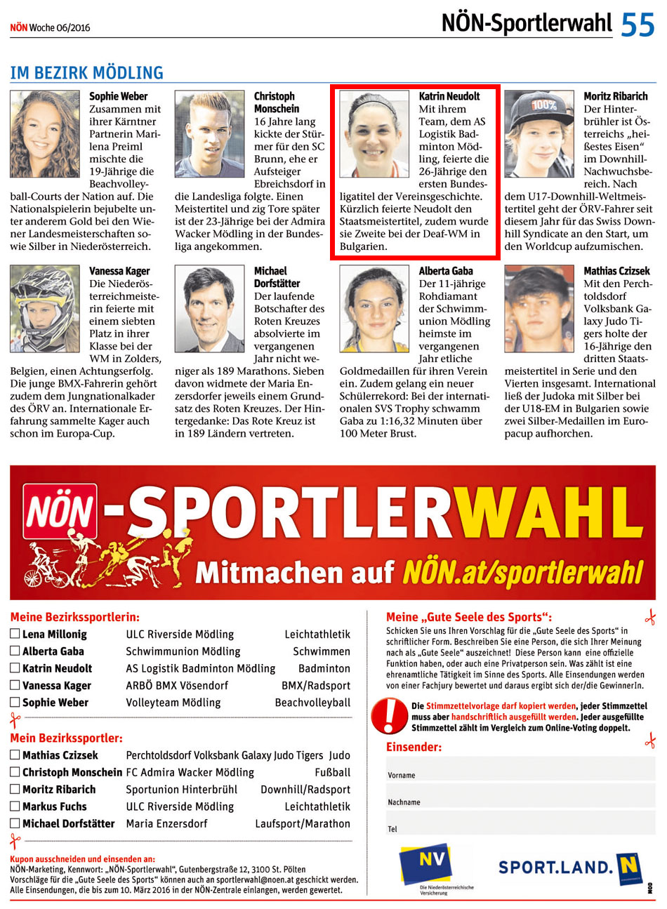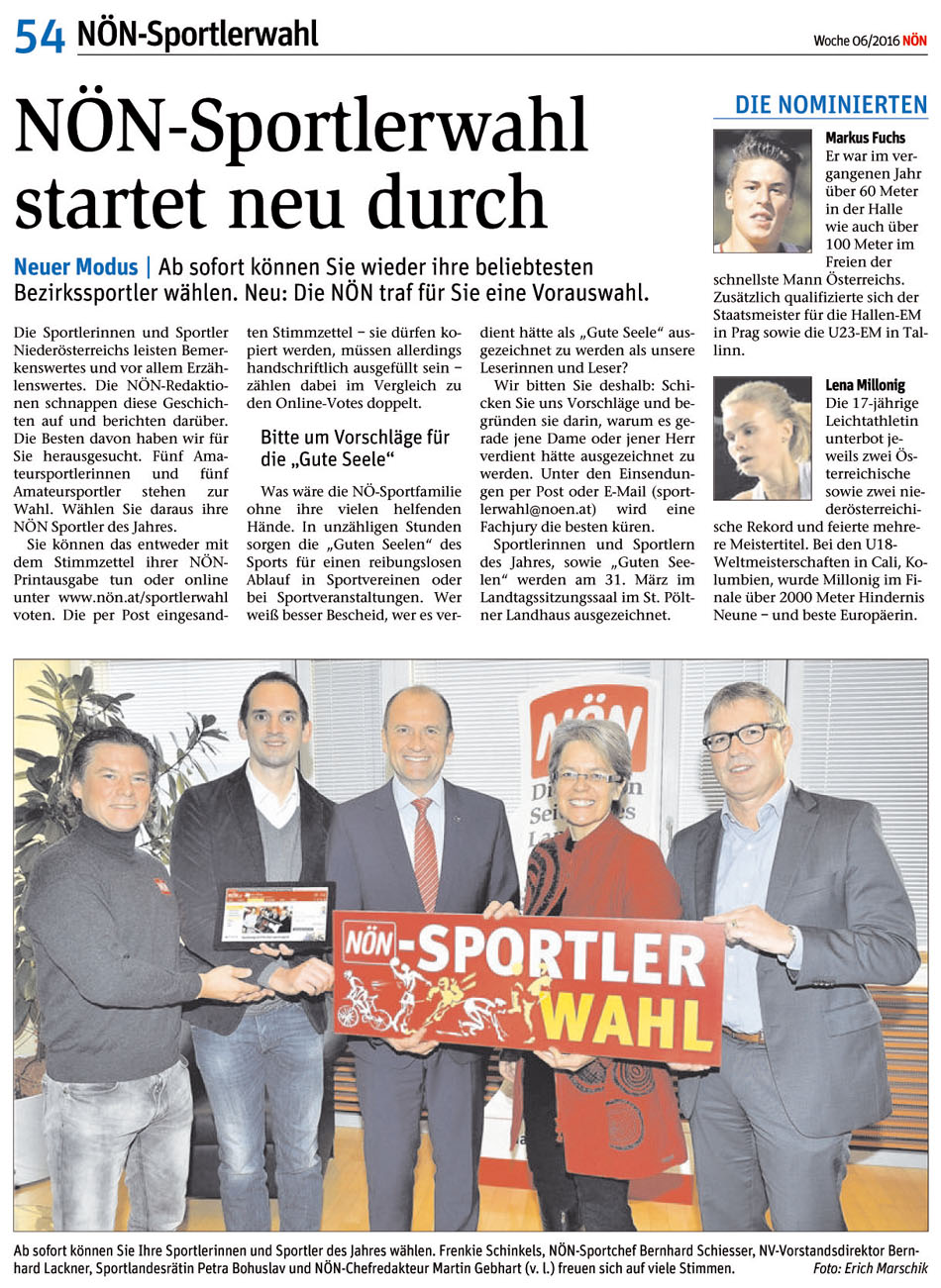 Danke für eure Stimmenabgaben durch die vielen Klicks. Die Sieger der Sportlerwahl 2015 werden in der NÖN der Woche 14 präsentiert.