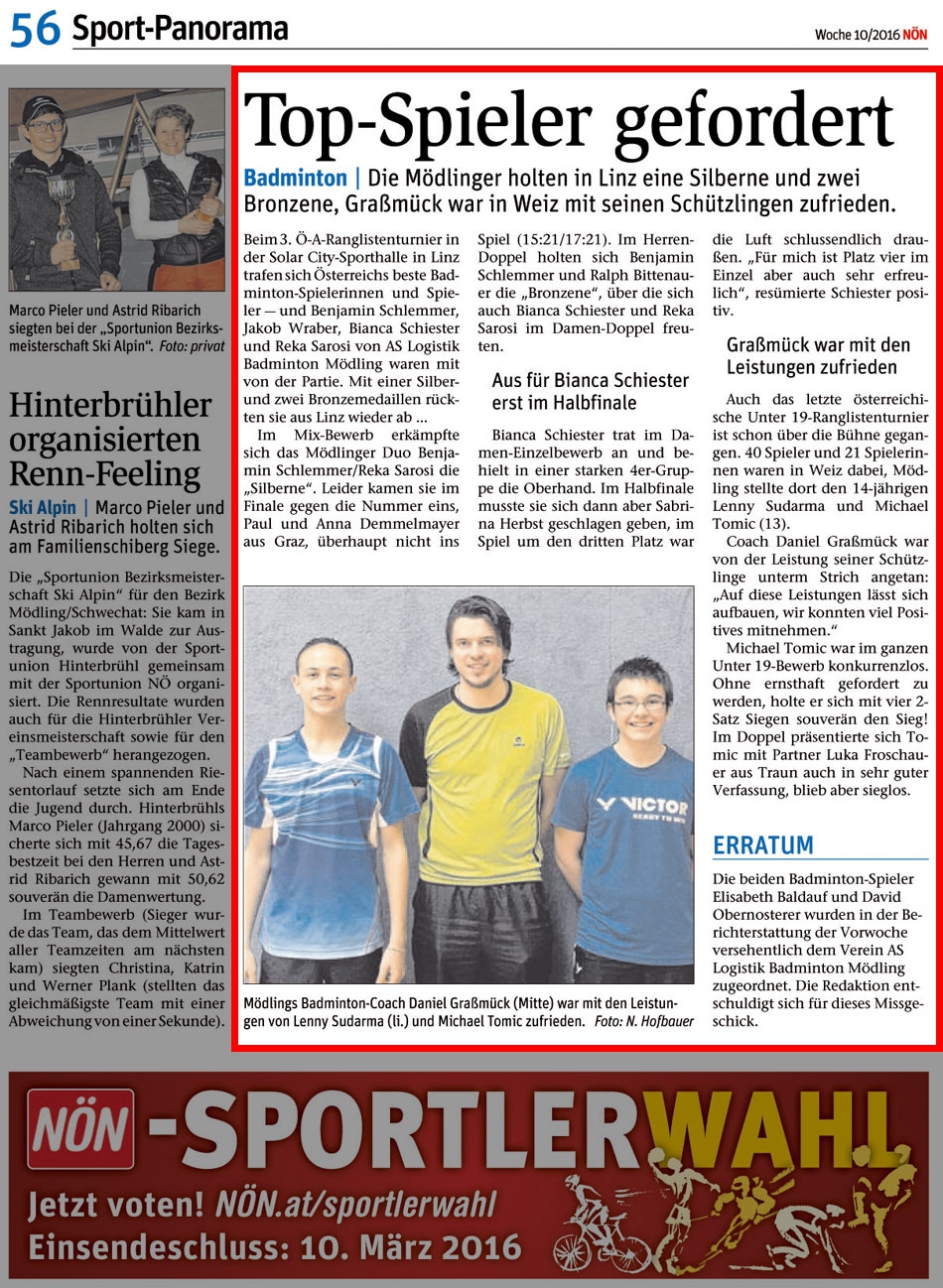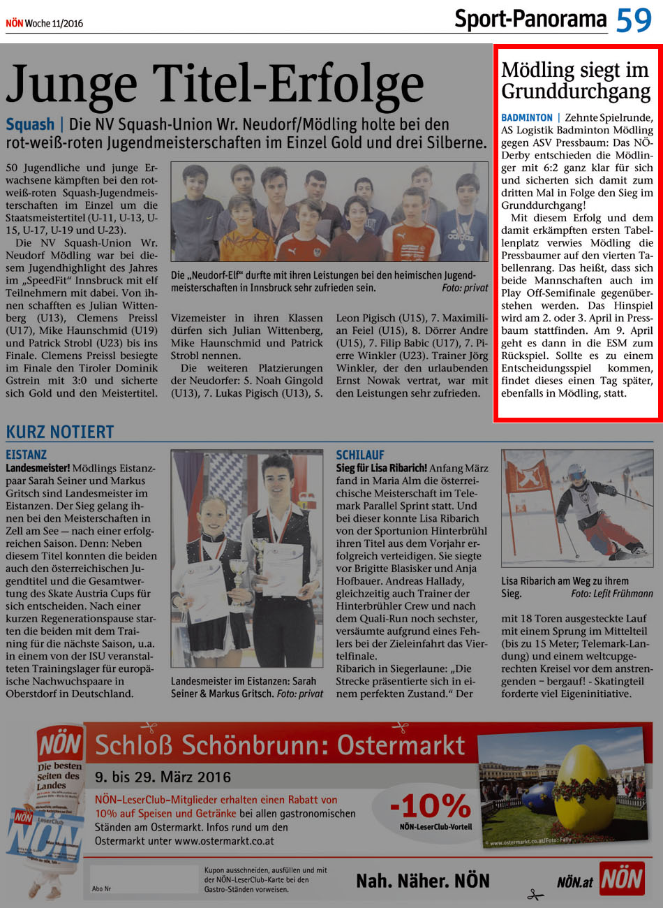 Am Samstag, 12.03.2016, fand mit dem NÖ Derby AS Logistik Badminton Mödling vs. ASV Pressbaum die letzte Runde des Grunddurchganges der Badminton Bundesliga statt. Mit einem 6:2 Sieg konnten wir uns zum dritten Mal in Folge den ersten Platz im Grunddurchgang sichern!