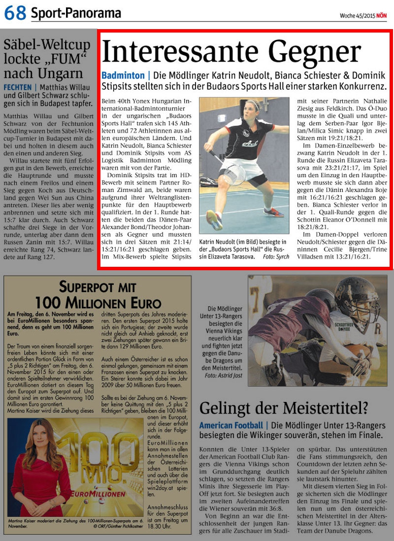 Am Samstag, 7.11., fand die 4. Runde der Badminton Bundesliga mit dem Spiel AS Logistik Mödling gegen WBH Wien statt. Gegen die ersatzgeschwächten Wiener ließen die Mödlinger nichts anbrennen und setzten sich klar mit 7:1 durch. Damit sicherte sich die Mannschaft um Spieler/Trainer Daniel Graßmück vorzeitig den Herbstmeistertitel.