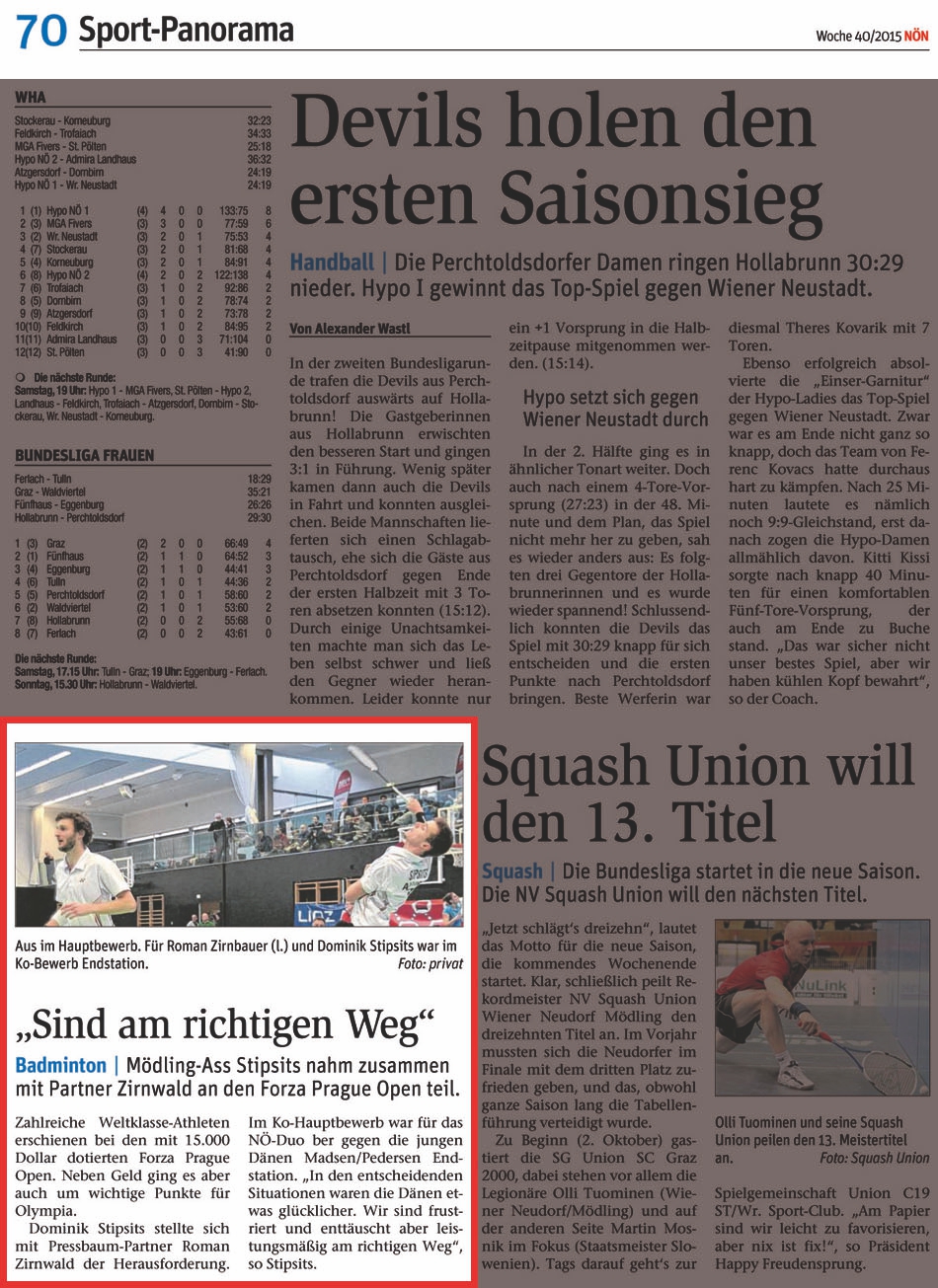 Die 1. Runde der Mannschaftsmeisterschaft 1. Klasse Ost war für den Sa, 03.10.2015 als die Mödlinger Heimpartie gegen die Mannschaften SFC Moving Wimpassing II und Union Badminton Krems II angesetzt.