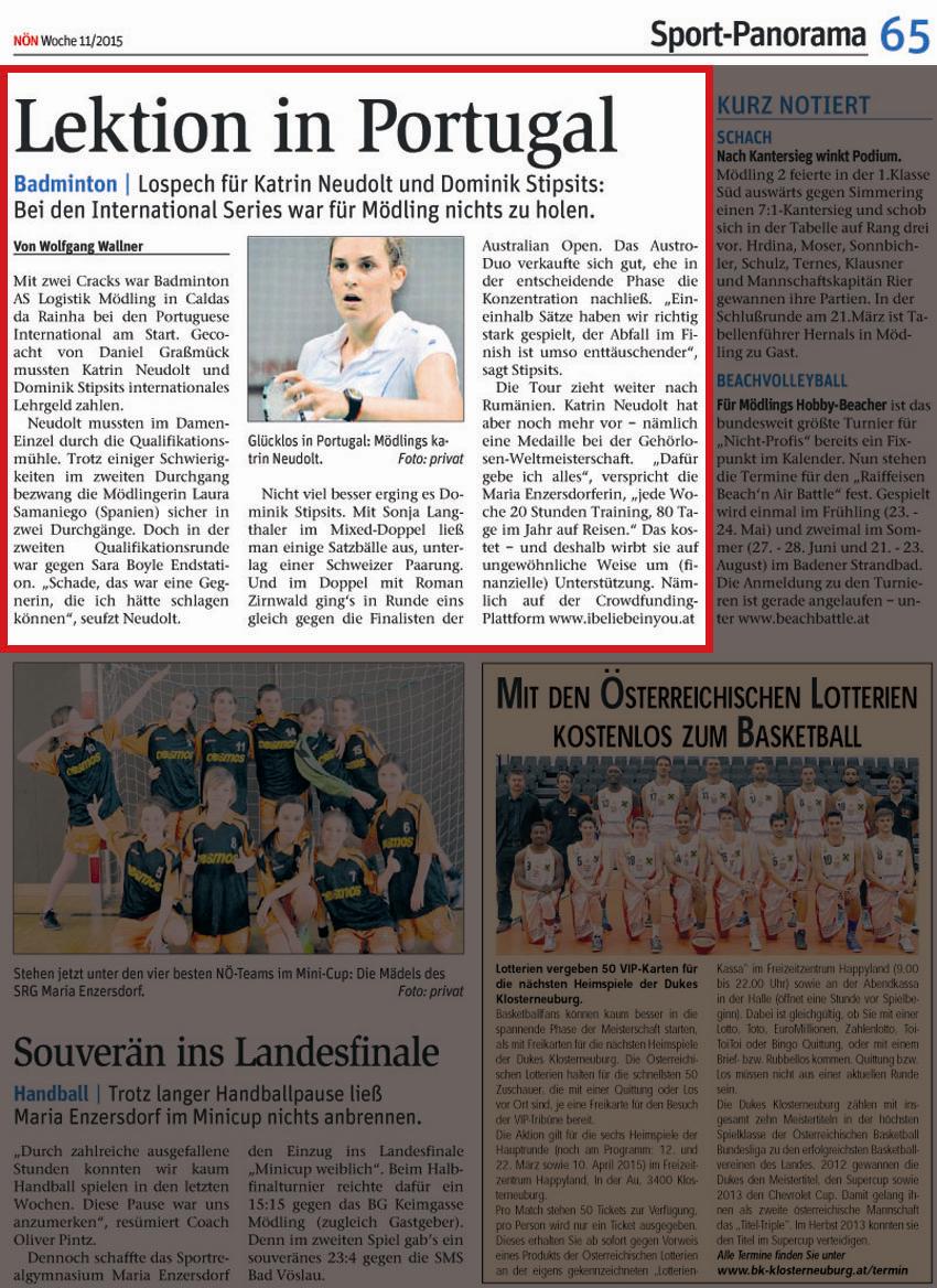Von 12.-15.3. fanden in Timisoara in die Rumanian International 2015 statt, ein Turnier der International Series Kategorie, an dem 170 Spieler aus 35 Ländern teilnahmen. Aus Mödling reisten Katrin Neudolt und Dominik Stipsits an. Bei diesem Turnier kam die Probezählweise mit 3 Gewinnsätzen auf 11 Punkte zur Anwendung.
