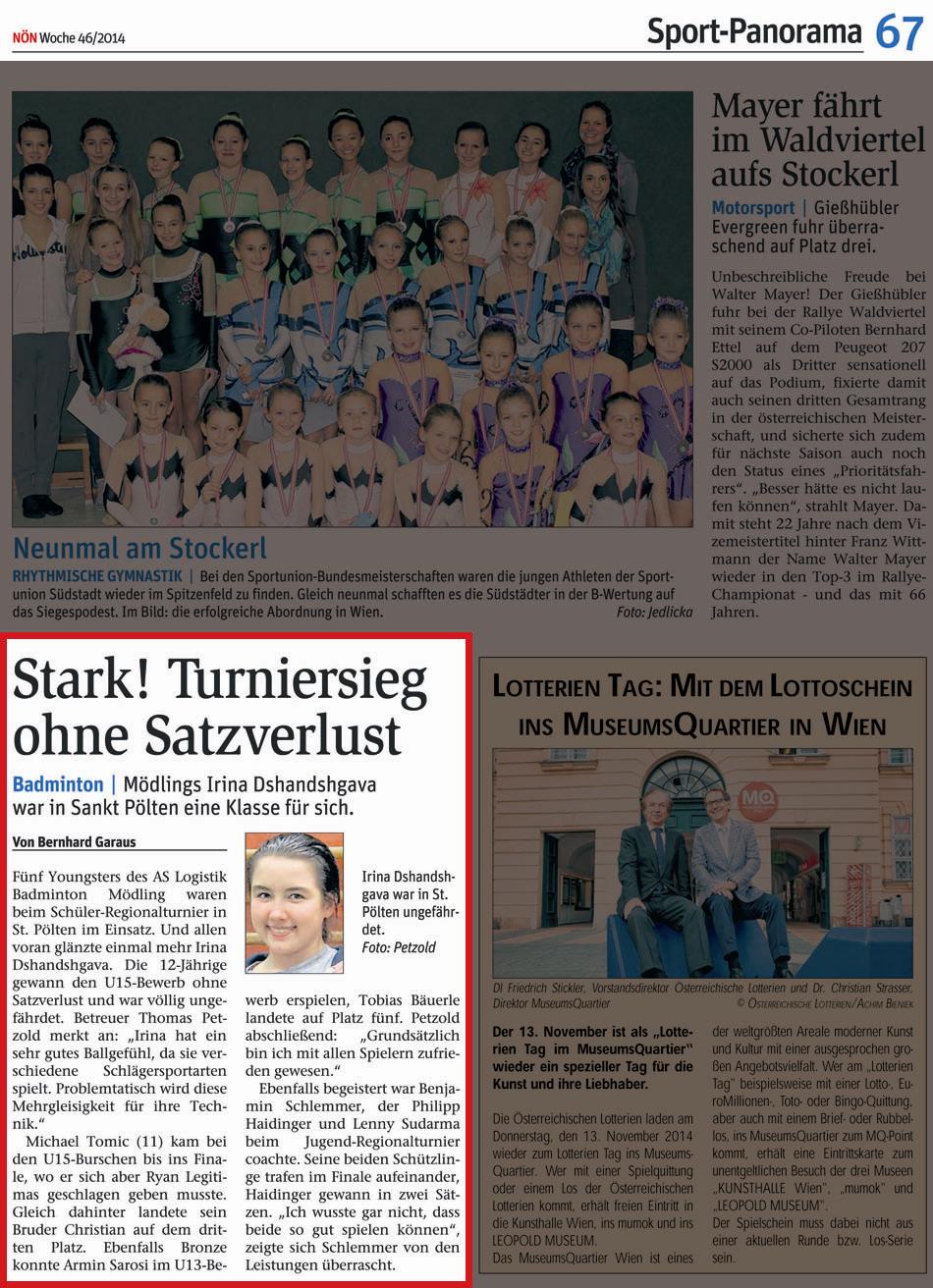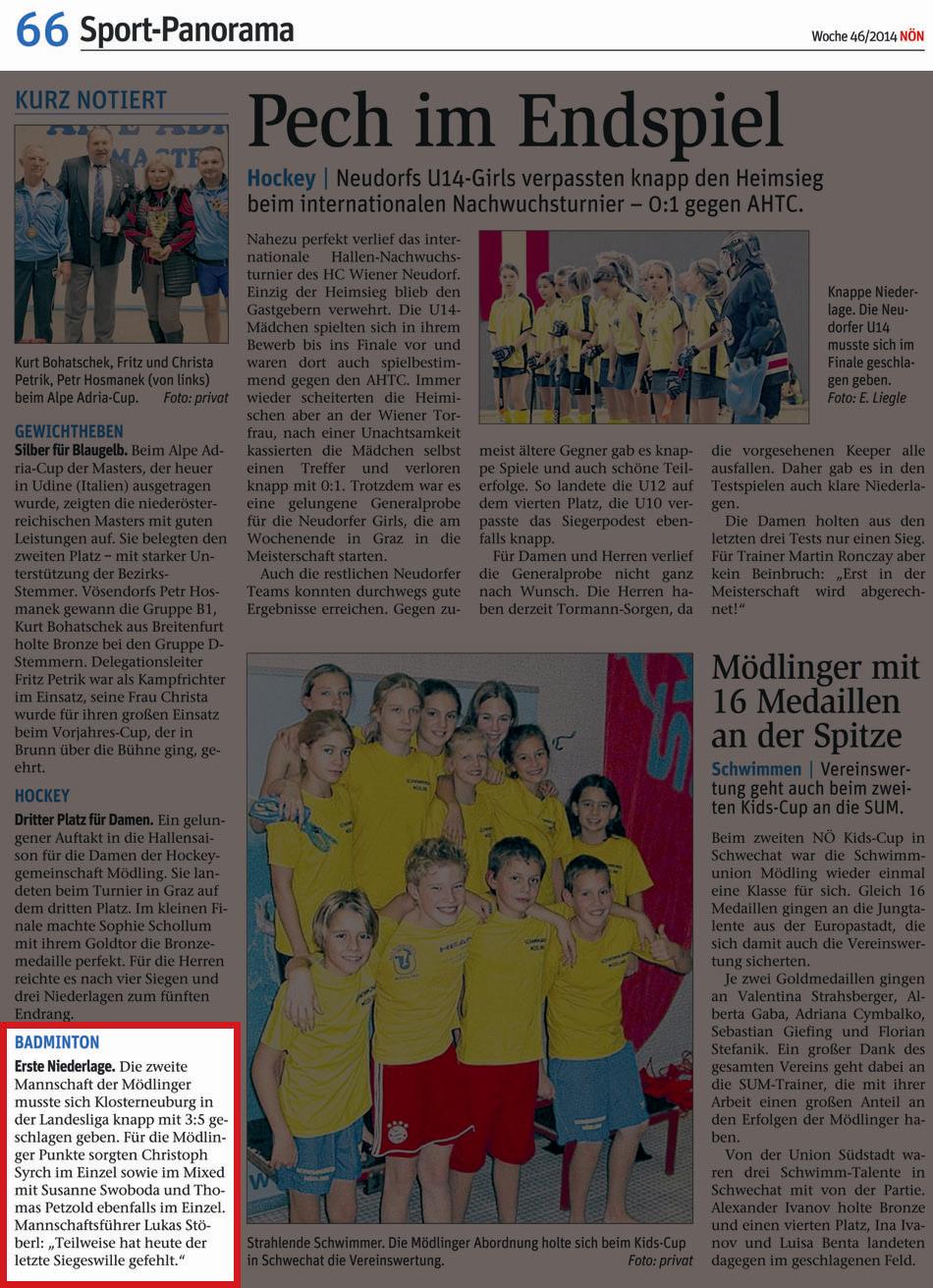 | 19:10 | Sportler-Ehrung durch Sportstadtrat Robert Mayer der Stadt Mödling Sportredakteur der NÖN Bernhard Garaus ist dazu eingeladen. |