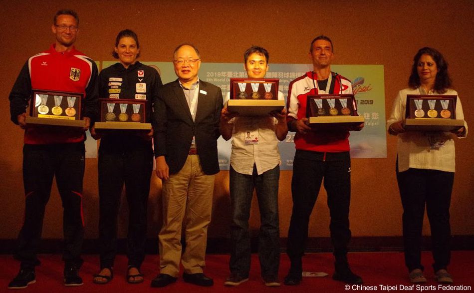 4. Bild v.l.: Die Medaillen-Sammlungen sind ein Geschenk der Chinese Taipei Deaf Sports Federation an die Gehörlosen-Sportverbände der an der WM teilnehmenden Ländern als Erinnerung und „Mahnung“ die Qualität ihrer Verbandsarbeit hoch zu halten.