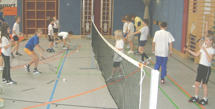 In einem Drittel der Sporthalle wurden Ballspiel-Sportarten probiert: Badminton, Beach Volleyball und Fußball. Für jede Ballspiel-Station waren lt. Zeitplan 10 Minuten vorgesehen in denen 25-30 Schüler ein "Schnuppertraining" absolvierten. Die Badminton-Station wurde von Badminton Mödling eingerichtet und die Kinder von einem Badmintontrainer des Vereines betreut. Er wurde unterstützt von der Leiterin der "Neigungsgruppe Badminton" der EHS, sie ist eine Kooperation mit Badminton Mödling. Mit einigen kleinen Hinweisen schaffte es jeder Schüler den "shuttlecock" übers Netz zu bekommen. Einige zählten mit wie oft der Ball hin und her ging. Am Ende der 5 Stunden zogen die Trainer Bilanz: 750 Kinder machten sich mit dem weißen Federball vertraut und waren stolz "Badminton" gespielt zu haben. Ein Schüler konnte sich von seinem "echten Badmintonschläger" nicht trennen und streichelte ihn zum Abschied mit den Worten: "Auf Wiedersehen heiliger Badmintonschläger". |