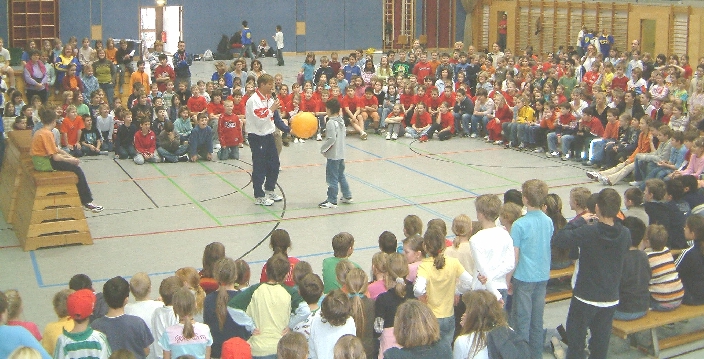 In einem Drittel der Sporthalle wurden Ballspiel-Sportarten wie jedes Jahr probiert: Badminton, Beach Volleyball und Fußball. Für jede Ballspiel-Station waren lt. Zeitplan 10 Minuten vorgesehen in denen 25-30 Schüler ein "Schnuppertraining" absolvierten. Mit einigen kleinen Hinweisen schaffte es jeder Schüler den Federball übers Netz zu bekommen. 850 Kinder versuchten sich mit "Racket" und "Shuttlecock" vertraut zu machen. Einige Kinder zählten wie oft der Federball hin und her ging. | ||||||||||||||||||||||