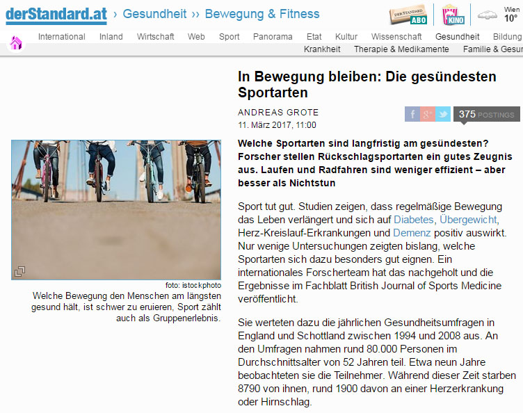 Der Standard berichtet am 11.3.17, dass Rückschlagsportarten zu den gesündesten Sportarten gehören und das Sterberisiko bei Personen, die zB Badminton spielen, im Vergleich zu anderen Sportarten geringer ist, ebenso wie das Risiko, an einer Herz-Kreislauf-Erkrankung zu sterben.
