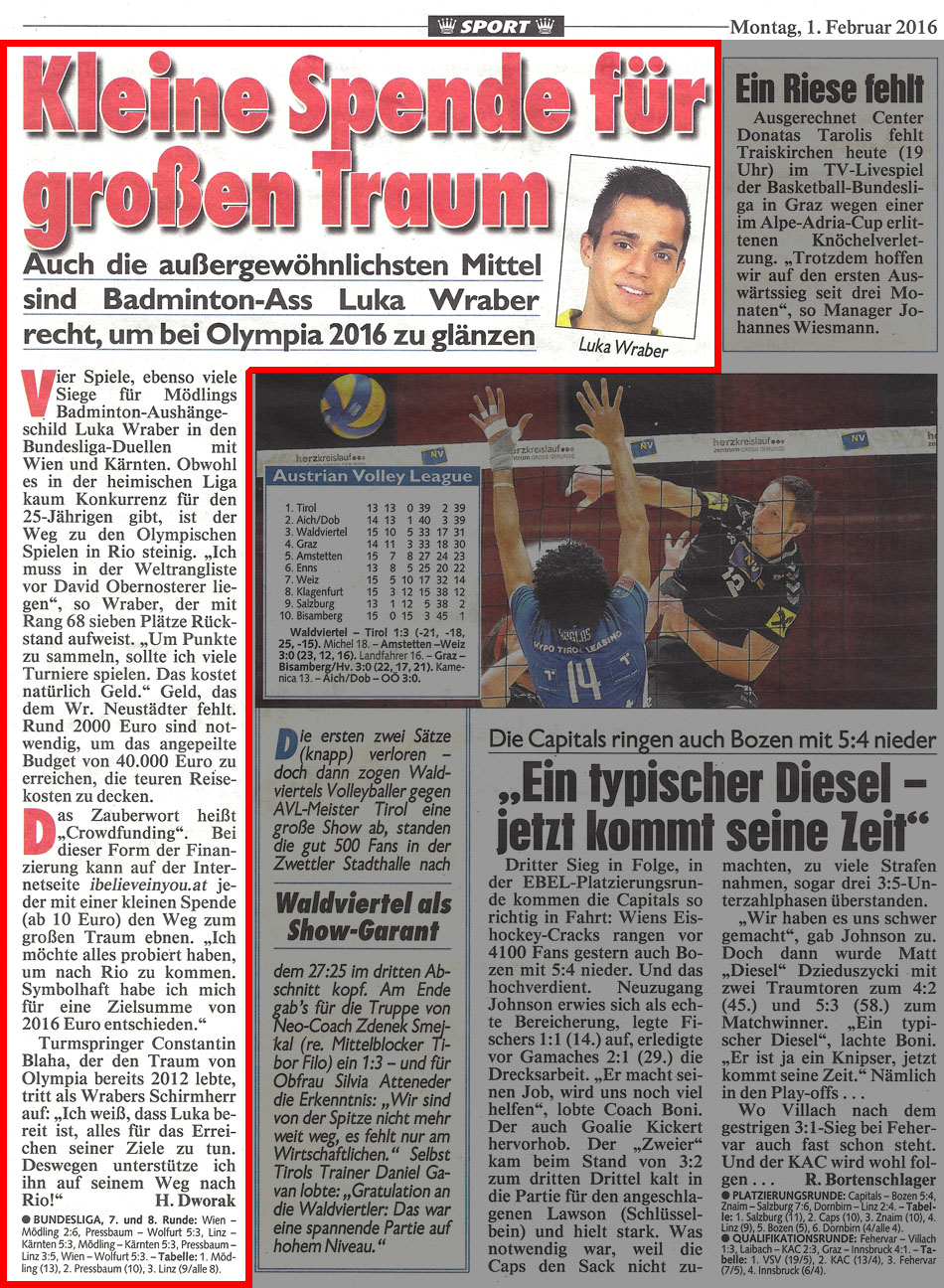 AUFGEWECKT ZUM TITEL / Im Duell der beiden Olympia-Anwärter behielt der Wr. Neustädter Luka Wraber im Finale der Badminton-Staatsmeisterschaft die Oberhand.