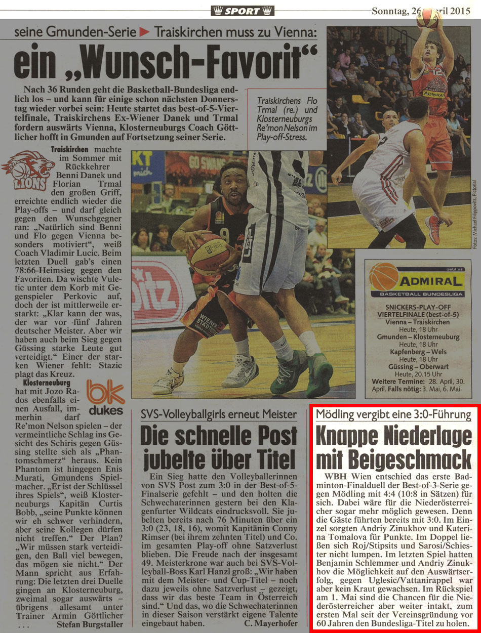 ERSTES FINALSPIEL GEHT KNAPP AN WIEN / AS Logistik Mödling unterliegt WBH im ersten Spiel der Best of 3-Serie - Beim Stand von 4:4 entschied das Satzverhältnis.