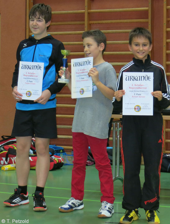 Tobias Bäuerle und Armin Sarosi spielten im U13-Bewerb und wurden unglücklicher Weise in die gleiche Quali-Gruppe gelost. Für beide waren die Quali-Gegner nicht wirklich ein Problem. Das Aufeinandertreffen der beiden Vereinskollegen brachte ein Spiel auf gleichem Niveau, in dem Armin das bessere Ende für sich hatte. Ergebnis: 21:19/21:11. Das Spiel um Platz 1-4 gegen Simon Habersack/Hernals war hart umkämpft und Armin verlor in 3 Sätzen mit 17:21/21:17/11:21. Im Spiel um Platz 3-4 hatte der Mödlinger keinerlei Probleme und holte den 3. Platz. Tobias spielte um Platz 5-8 und siegte in 2 Spielen im wesentlichen mit wenig Problemen und wurde guter Fünfter.