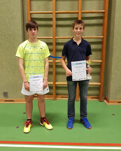 Aus Mödling nahm Tobias Bäuerle teil. Er konnte sich souverän ohne Satzverlust ins Finale vorkämpfen. Dort traf er auf Robert Stella (Sportunion Donaufeld). Bei einem Stand von 12:3 für Tobias im dritten Satz verletzte sich Stella und somit ging der Turniersieg direkt an unseren Youngster! Christian und Michael Tomic unterstützen und coachten ihren Teamkollegen während des ganzen Turniers.