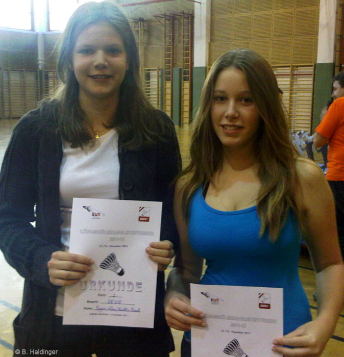 Im U15-DD hatten Sarah Kuchler/Nina Sorger aus Pressbaum zunächst ein Freilos, schlugen die Wienerinnen Silitonga Naomi/Weihs Nina und standen im Finale gegen das Nr.1 gesetzte Ohlsdorfer Paar Jana Haas/Katharina Hochmeir. Es entwickelte sich ein sehenswertes, kampfbetontes Spiel, dass bereits im 1. Satz auf Messers Schneide stand. Dann bekam das NÖ-Paar Auftrieb und holte sich den 2. Satz klar. Der Entscheidungssatz war von Anfang an ausgeglichen, doch die letzten entscheidenden Punkte machten die Gegner. Ergebnis: 21:23/21:15/19:21.