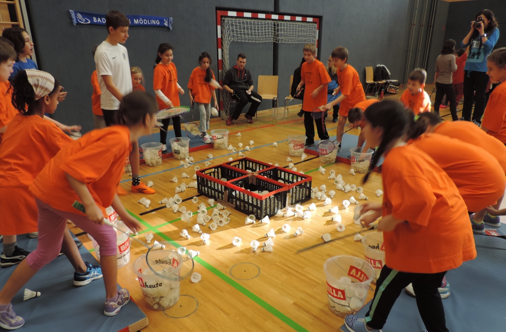 An der Badminton-Station galt es in 1 Minute so viel wie möglich an Federbällen in die Kiste zu schlagen. Manche Klassen schafften es knapp an die 400 Bälle in die Kiste zu spielen. Einen Vorteil hatte da die Klasse 3b der VS Brunn, die hat ganzjährigen Badminton-Unterricht bei unserer BL-Spielerin Bianca Schiester. Die Klasse holte sich den 2. Gesamtrang.