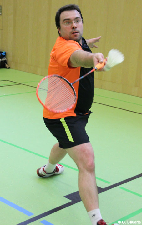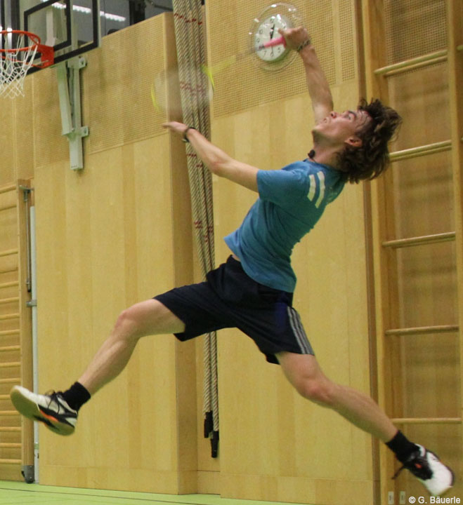 HE 1: Die letzte Partie des Tages bestritt Philipp Graßmück gegen den von Anfang an klar überlegenen Markus Kohlhauser. Und auch wenn er mit großem Einsatz dabei war, musste er sich doch aufgrund einiger Eigenfehler und der großen Spielstärke seines Gegners mit 12:21/10:21 geschlagen geben.