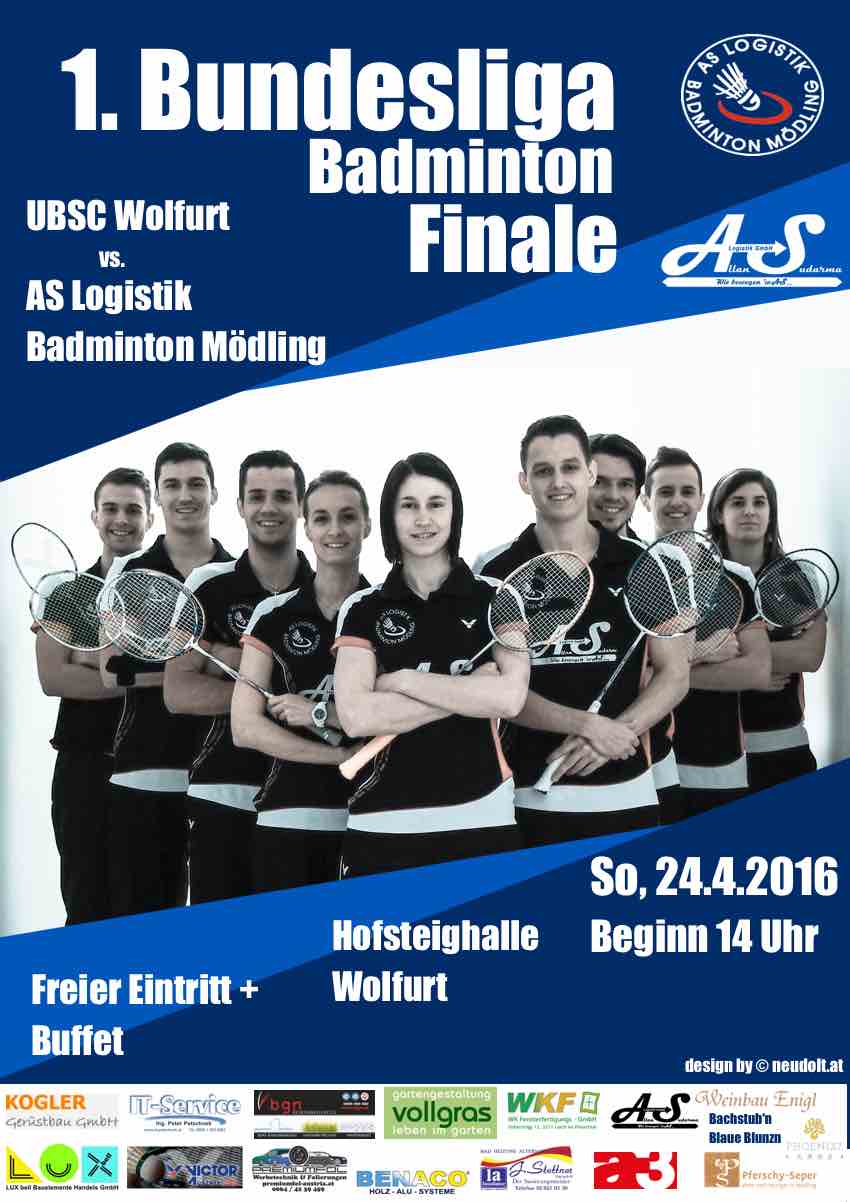 Am Sonntag, 24.4., findet um 14:00 das Hinspiel des diesjährigen Bundesligafinales zwischen UBSC Wolfurt und AS Logistik Badminton Mödling in der Hofsteighalle in Wolfurt statt. Für unsere Mannschaft ist es nach dem letztjährigen Meistertitel die zweite Finalteilnahme in Folge.