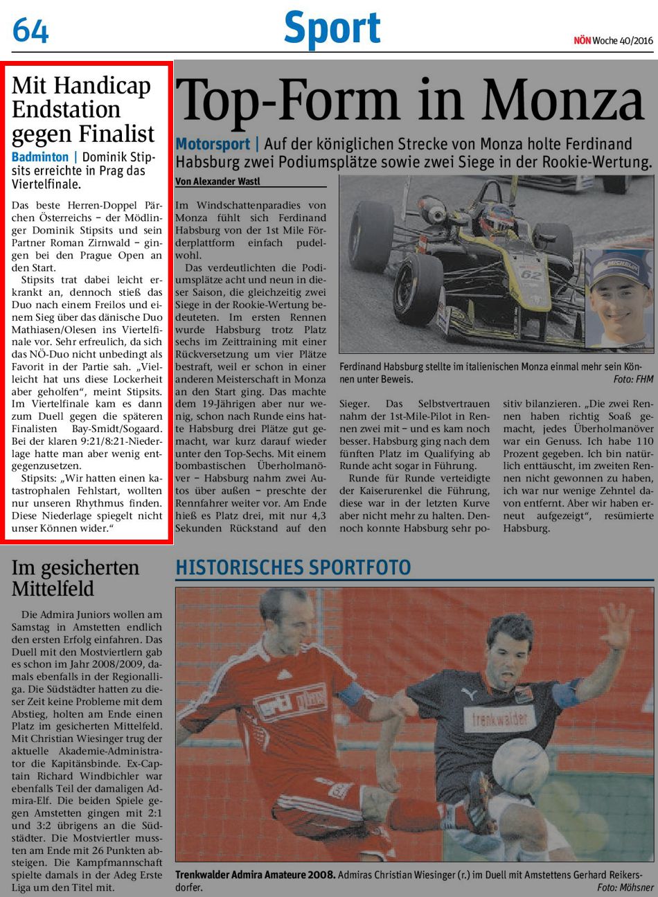/ Dominik Stipsits erreichte in Prag das Viertelfinale