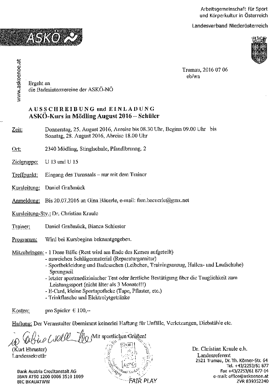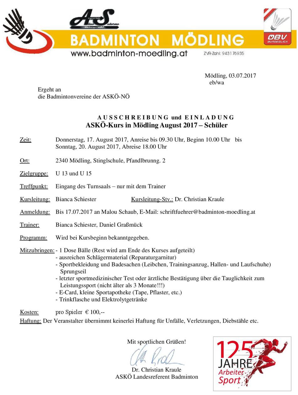 ASKÖ-Kurs für Jugend und Schüler vom 25.- 28.08.2016 in Mödling.Anmeldungen werden noch angenommen.