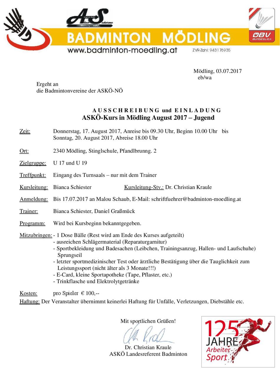 AUSSCHREIBUNG für ASKÖ-Kurs für Jugend und Schüler